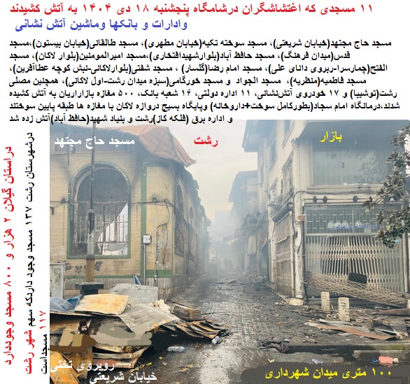 در اغتشاشات شامگاه پنجشنبه ۱۸ دی ۱۴۰۴ رشت: ۱۱ مسجد ومصلی ، ۵۰۰ مغازه بازارزیان