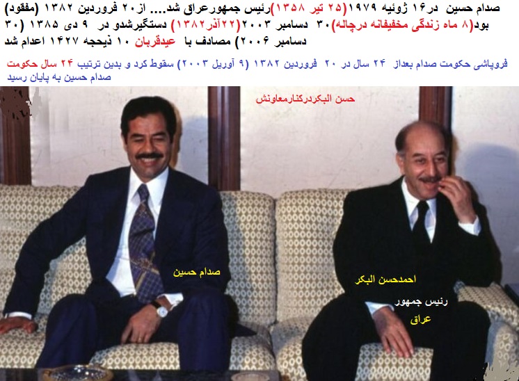 البته باید ۱۱سال «ریاست صدام» رادرزمان حکومت احمد حسن البکر اضافه کنیم که می شود ۳۵ سال برعراق حکمرانی کرد.۱۹ بهمن ۱۳۴۱