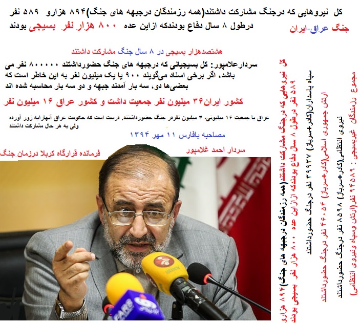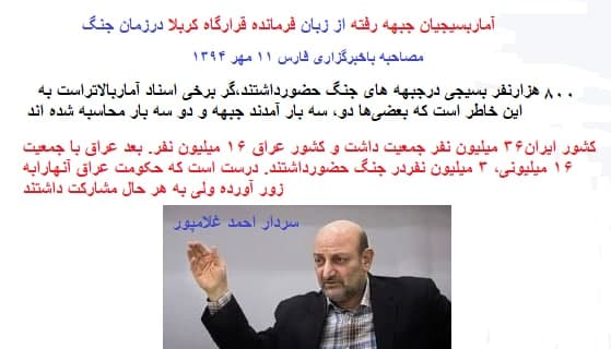 سردارعلامپور: اگر برخی اسناد میگویند ۹۰۰ یا یک میلیون نفر به این خاطر است که بعضیها دو، سه بار آمدند جبهه و دو سه بار محاسبه شده اند. اینکه دیگر خرج نداشته و ارز نمیخواست.(محاسبه).