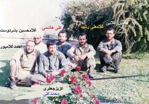 از راست ردیف ایستاده: شهید سیفالله حیدرپور، ناشناس، ناشناس،« احمدغلامپور» (فرمانده قرارگاه کربلا)، غلامعلی رشید، ناشناس، شهید علی هاشمی، حسن دانایی و امین شریعتی/ ردیف نشسته: شهید مهدی زینالدین، شهید حسین خرازی و کوسهچی.
