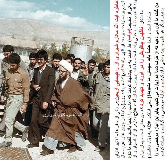 مکارم شیرازی: از خاطراتی که من هیچ وقت فراموش نمیکنم، گاهی خسته میشوم و ناراحت میشوم از بعضی چیزها و ناچارم یک خاطرات شاد کنندهای را به ذهنم بیاورم، میروم توی آن حال و هوا و فکر میکنم از نجف داریم حرکت میکنیم و رفتیم زیر درختها، از آنجا رفتیم کجا و غیره، اینها را در نظر مجسم میکنم تا رفع آن خستگی و ناراحتی شود.