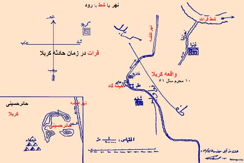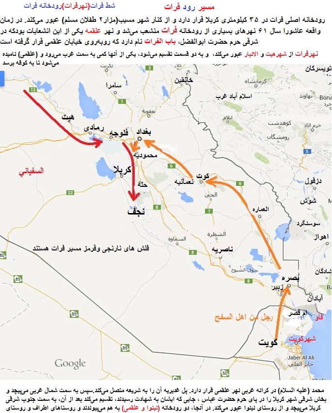 توضیح مدیریت سایت-پیراسته فر:«نهرفرات» در ۳۵ کیلومتری شهر کربلا قرار دارد و از کنار شهر مسیب(مزار دو طفلان مسلم) عبور می کند در زمان واقعه عاشورا، نهرهای بسیاری از رودخانه فرات منشعب میشد و «نهر علقمه» یکی از این انشعابات بود. در شرقی حرم حضرت ابوالفضل، باب الفرات نام دارد که روبهروی «خیابان علقمی» قرار گرفته است، «عقلمی»(نهرعلقمه) نام نهر منشعب از فرات بود که امروزه اثری از آن وجود ندارد و تنها خیابانی که قبلا جای نهر بوده، به همین نام شناخته میشود