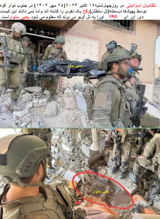 اسرائیل یک ماه پیش «خبرترور یحیی سنوار» راداده بود،دربمباران«تل السلطان»(شهر رفح) واما مطمئن نبودندکه فردی که کشته اند«رئیس دفتر سیاسی حماس»است یانه ،برای راستی آزمایی پیکر شهیدیحیی سنوار را به اورشلیم بردندبرای آزامایش (DNA)...وزیر خارجه اسرائیل، روز پنجشنبه ۱۷ اکتبر ۲۰۲۴(۲۶ مهر ۱۴۰۳) کشته شدن یحیی سنوار، رهبر حماس را تایید کرد.