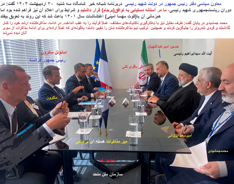 «معاون سیاسی دفتر رئیس جمهور در دولت شهید رئیسی» دربرنامه «شبکه خبر» شامگاه سه شنبه ۳۰ اردیبهشت ۱۴۰۴ گفت:«در دوران ریاستجمهوری شهید رئیسی، ما در آستانه دستیابی به توافق قرار داشتیم و شرایط برای اعلام آن نیز فراهم شده بود»اما همزمانی با اغتشاشات سال ۱۴۰۱ باعث شد که این روند به تعویق بیفتد.(مرگ مهساامینی)