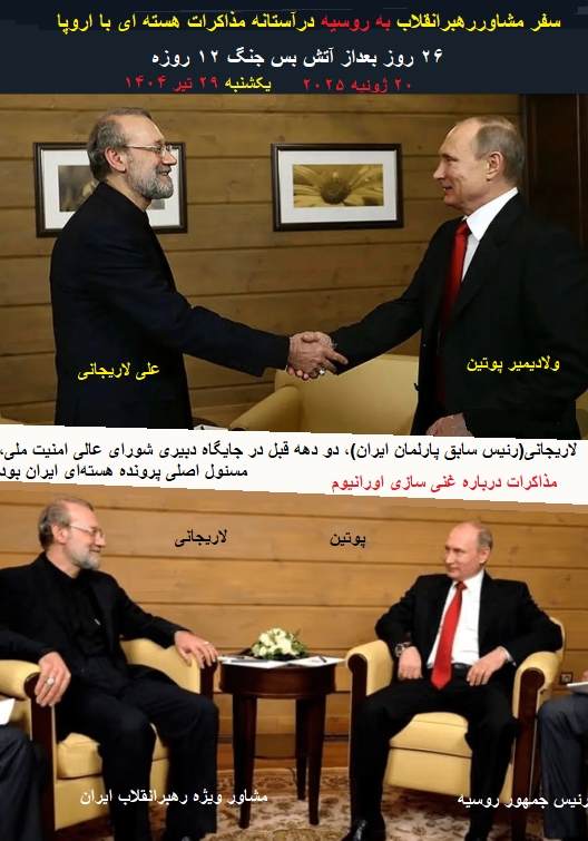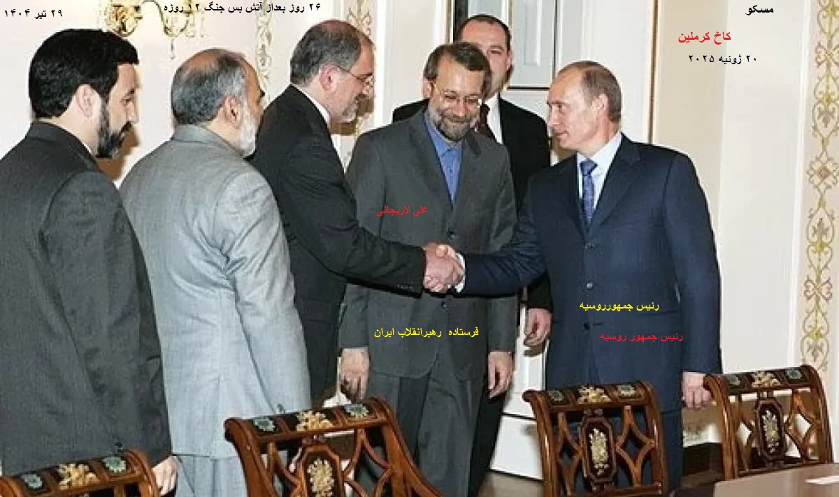توضیح مدیریت سایت-پیراسته فر:دیدار باپوتین:۲۶ روز بعداز آتش بس جنگ ۱۲ روزه سفر مشاوررهبرانقلاب(لاریجانی)به روسیه ،درآستانه مذاکرات ایران با«تروئیکای اروپایی»(آلمان، فرانسه و انگلیس)