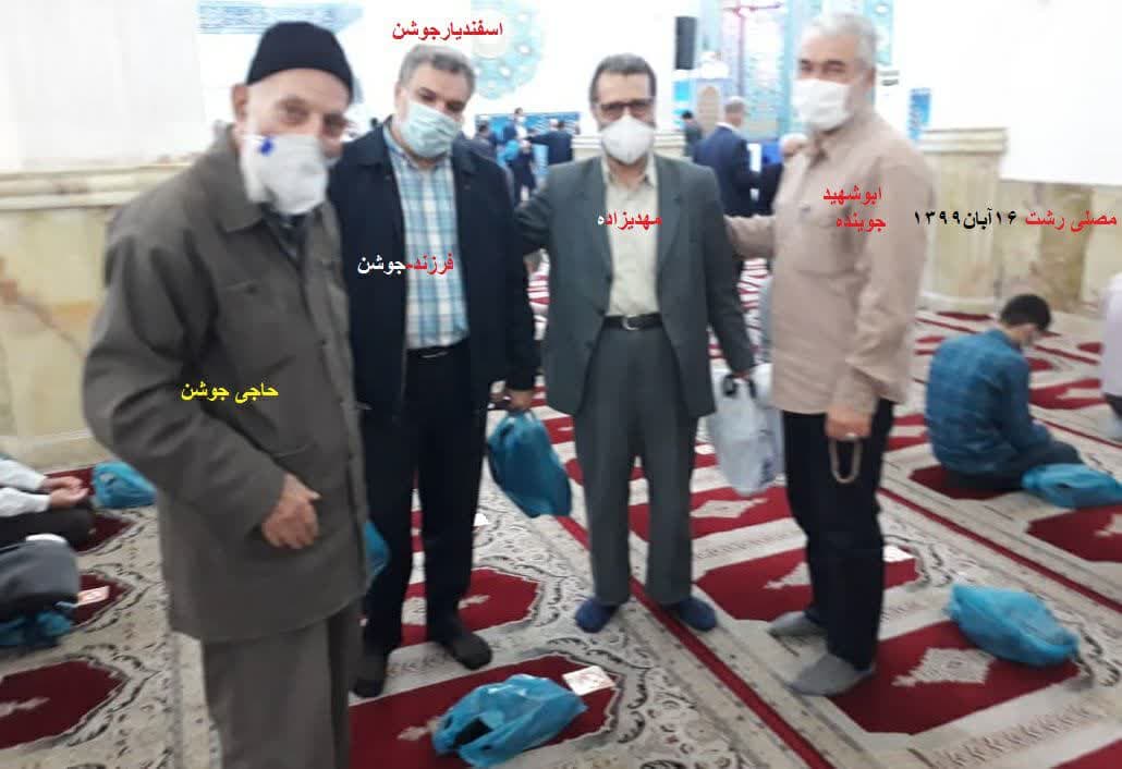 بترتیب ازچپ:«حاج حسن جوشن»،«اسفندیارجوشن»(فرزندحاجی جوشن)،مهدیزاده وجوینده درمصلی رشت،بعدازپایان نماز جمعه.۱۶ آبان ۱۳۹۹