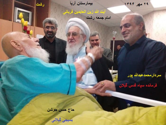 عیادت امام جمعه رشت(آیت الله زین العابدین قربانی) وفرمانده سپاه قدس گیلان(سردار محمدعبدالله پور) از «حاجی جوشن» دربیمارستان آریا رشت ، ۲۹ مهرر ۱۳۹۶