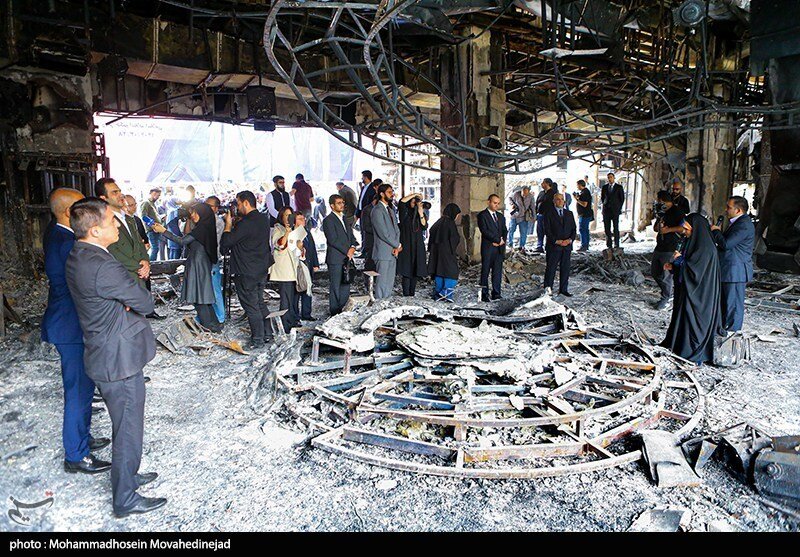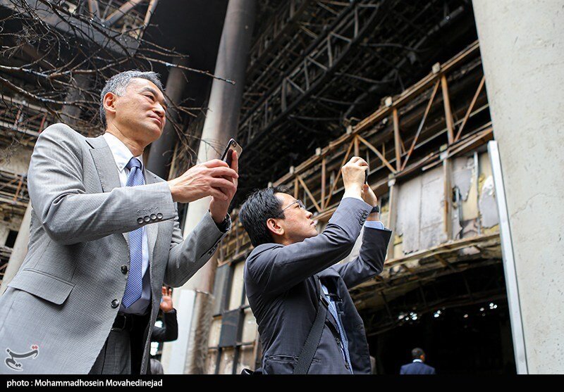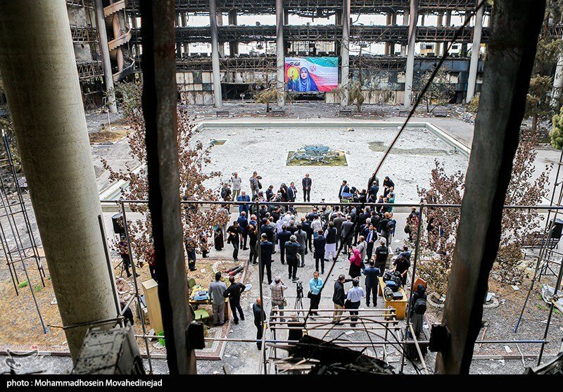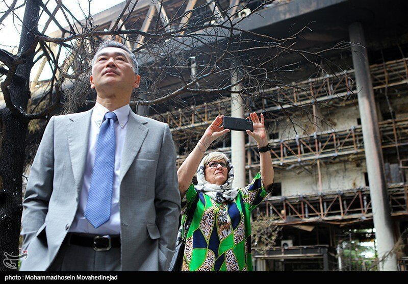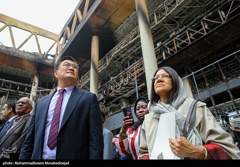 بازدید سفرای خارجی از ساختمان شیشه ای سوخته صداوسیما ؛ توضیحات سحر امامی از لحظه وقوع حادثه به ۲۸ سفیر خارجی