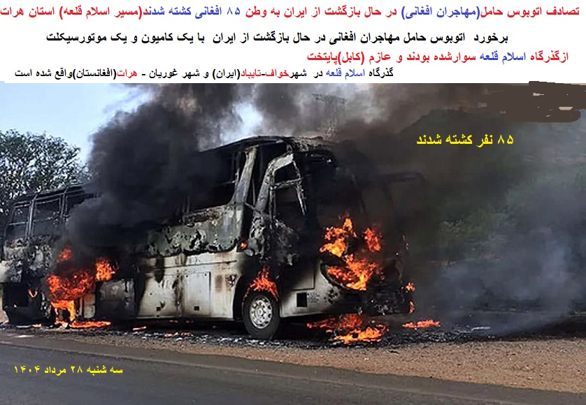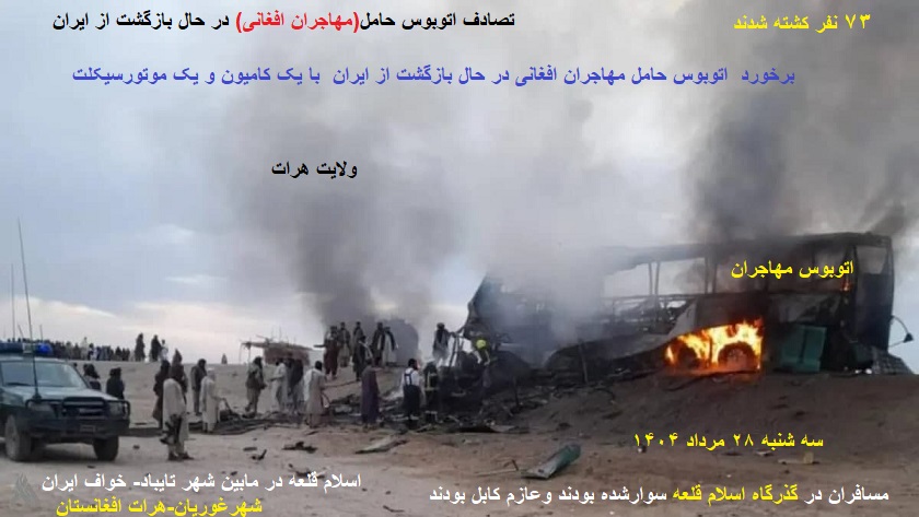 توضیح مدیریت سایت-پیراسته فر:کشته شدن ۷۳ افغانی در«تصادف اتوبوس حامل مهاجران افغانی در حال بازگشت از ایران» با یک کامیون و یک موتورسیکلت» همه مسافران مهاجرانی بودند که در «اسلام قلعه»(هرات)سوار اتوبوس شده بودند(سه شنبه۲۸ مرداد ۱۴۰۴)