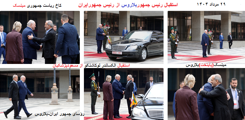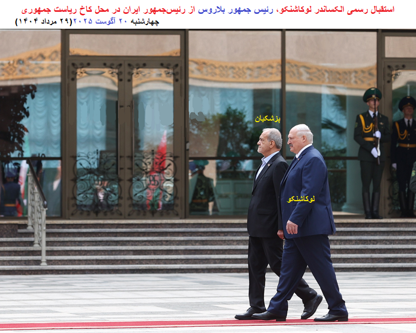 «دکترمسعود پزشکیان»(رئیسجمهور ایران) که به دعوت «رئیسجمهور بلاروس»به منظور سفری رسمی به این کشور سفر کرده، صبح امروز چهارشنبه ۲۰ آگوست ۲۰۲۵(۲۹ مرداد ۱۴۰۴)، در محل کاخ ریاست جمهوری، از سوی «الکساندر لوکاشنکو»(رئیس جمهور بلاروس) مورد استقبال رسمی قرار گرفت.