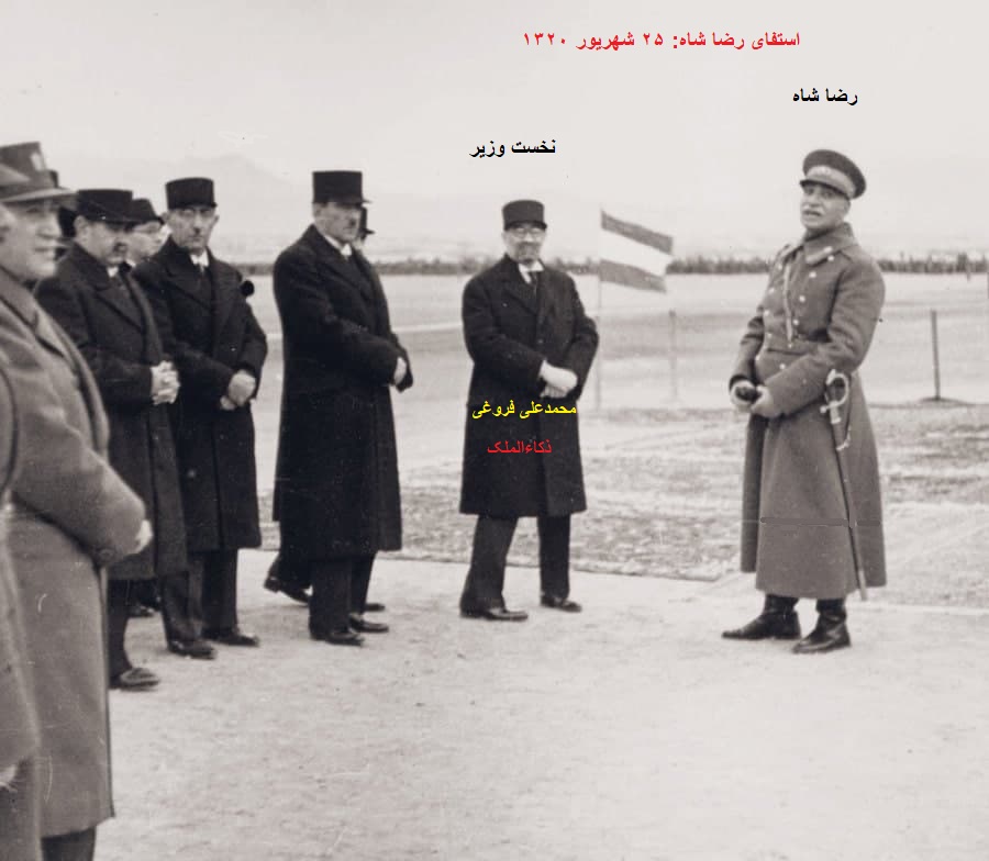 محسن فروغی، پسر ذکاءالملک فروغی(نخست وزیر): «پدرم کاغذی را که چند دقیقه قبل در منزل تحریر کرده و در جیب خود قرار داده بود، بیرون میآورد و شروع به خواندن آن میکند. رضاشاه با تعجب میگوید: معلوم میشود قبلا استعفای مرا تنظیم نمودهاند».