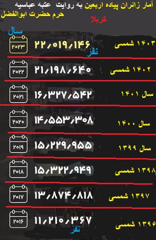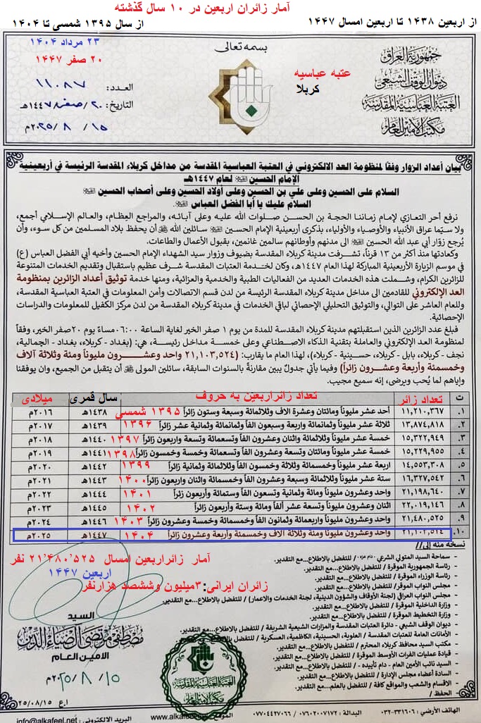 توضیح مدیریت سایت-پیراسته فر:آمارجمع آوری شده ازمنابع مختلف است واما آمار کل زائران از عتبه عباسیه(تولیت حرمین کربلا)می باشد.
