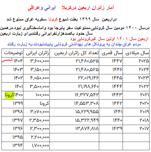جدول آمارزائران اربعین(ایرانی)عراقی