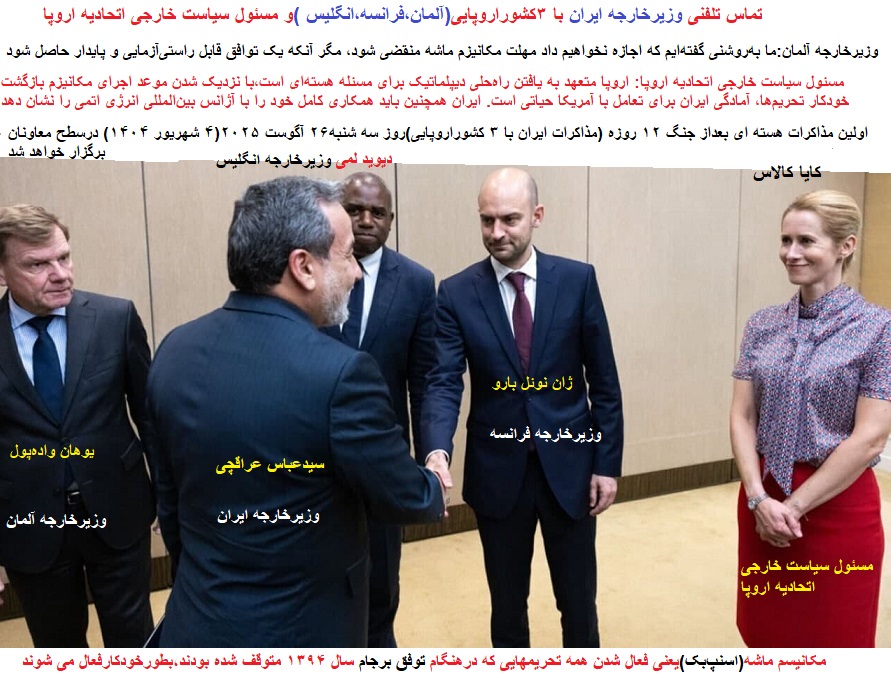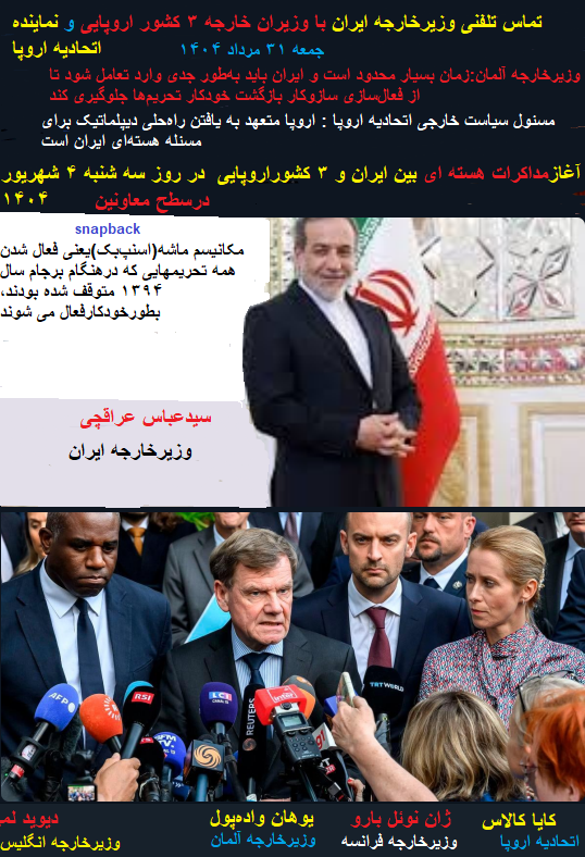 «مذاکرات ایران با ۳ کشوراروپایی» درروز سه شنبه۲۶ آگوست ۲۰۲۵(۴ شهریور ۱۴۰۴) درسطح معاونان برگزار خواهد شد.