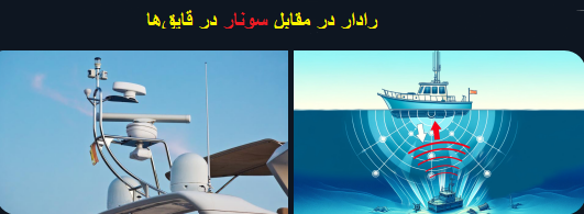 «رادار های سونار» نیز دقیقا مشابه عمل می کنند و در سطح و روی دریا امواج صوتی پالس مانندی را به طرف جسم گسیل می کنند هنگامی که امواج بازگشت داده می شود با تغیر صدای آن متوجه وجود کشتی های دیگر یا زیر دریایی های دیگر می شوند.