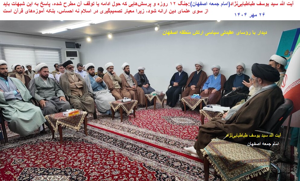 آیت الله سید یوسف طباطبایینژاد(امام جمعه اصفهان)در جنگ ۱۲ روزه و پرسشهایی که حول ادامه یا توقف آن مطرح شده، پاسخ به این شبهات باید از سوی علمای دین ارائه شود، زیرا معیار تصمیمگیری در اسلام نه احساس، بلکه آموزههای قرآن است.