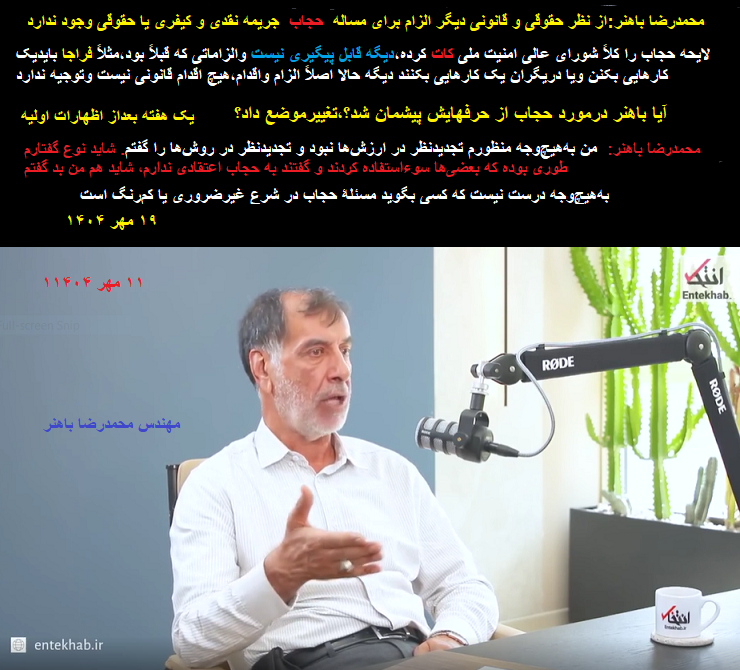 محمدرضا باهنر: پارادایمها در جمهوری اسلامی یک مقدار نرم دارد اصلاح میشود. از نظر حقوقی و قانونی، لایحه حجاب دیگر قابل پیگیری نیست. دیگر الزام برای مساله حجاب و جریمه نقدی و کیفری یا حقوقی وجود ندارد.