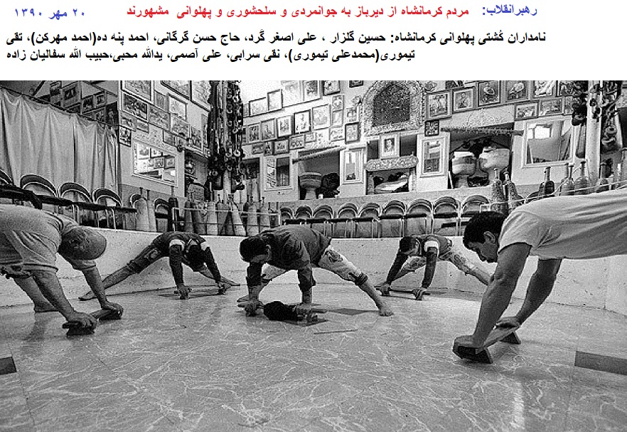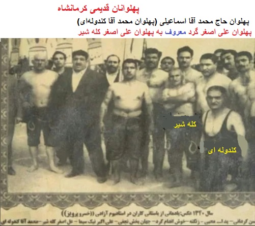 نامداران کُشتی پهلوانی کرمانشاه:«حسین گلزار»، «علی اصغر گُرد»، «حاج حسن گرگانی»، «احمد پنه ده»(احمد مهرکن)، «تقی تیموری»،«محمدعلی تیموری»، «نقی سرابی»، «علی آصمی»،« محمد آقا کندولهای»،«یدالله لباف»،احمدرشیدی»، «یدالله محبی»، «جهانبخش نجفی»،«علی اکبرنیک سیما»،«حبیب الله سفالیان زاده»