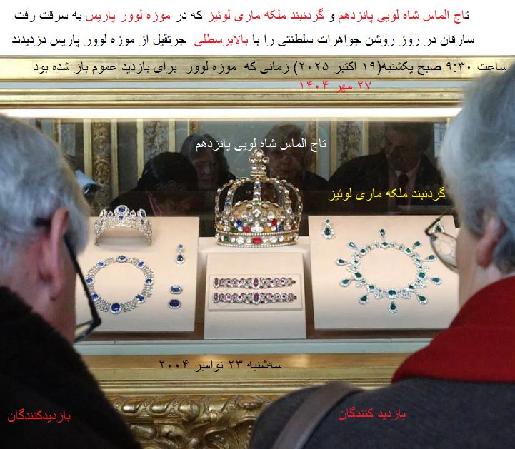 توضیح مدیریت سایت-پیراسته فر:چهار نفر در این سرقت دست داشتهاند: ،«سارقان با استفاده از یک جرثقیل و شکستن پنجرهای در طبقه بالای موزه لوور پاریس وارد این موزه شدند و جواهرات گرانبهای سلطنتی فرانسه را به سرقت بردند و سپس با موتور سیکلت گریختند»،دو نفر با لباس کارگران ساختمانی و جلیقههای ایمنی زرد روی بالابر و دو نفر دیگر هر کدام سوار بر اسکوتر شده بودند،سرقت در روز روشن، حدود ۳۰ دقیقه پس از باز شدن موزه(ساعت ۹:۳۰ صبح) در حالی که بازدیدکنندگان از قبل در داخل موزه بودند،اتفاق افتاده است، قطعه سرقت شده«تاج همسر ناپلئون سوم»(امپراتریس اوژنی) بوده است.