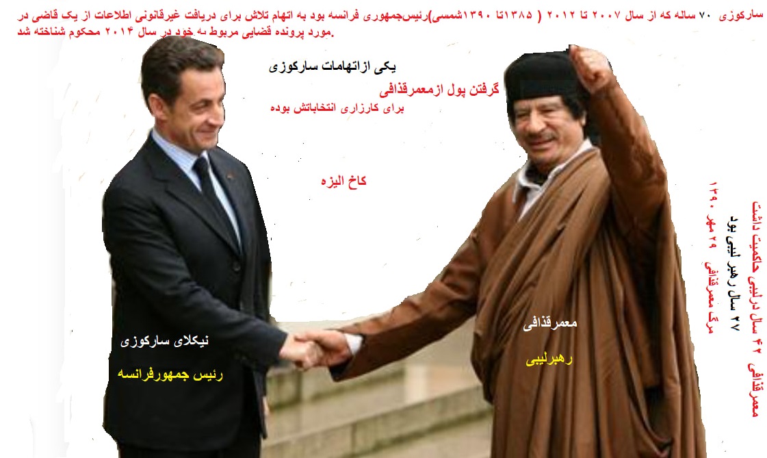 رئیس جمهور سابق فرانسه ۵۰ میلیون یورو از معمرالقذافی(رئیس جمهور لیبی)در سال ۲۰۰۷ دریافت کرده که از طریق یک واسطه به فرانسه منتقل گردیده بود.