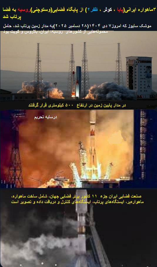 توضیح مدیریت سایت-پیراسته فر:«موشک سایوز که امروز(۷ دی ۱۴۰۴) به مدار زمین پرتاب شد، حامل محمولههایی از کشورهای مختلف از جمله روسیه، ایران، بلاروس و کویت است.»