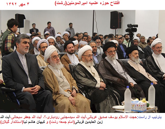 افتتاح حوزه علمیه امیرالمومنین(رشت) ۴ مهر ۱۳۹۲ «حجت الاسلام یوسف صدیق عربانی»،«آیت الله سید مجتبی رودباری»،«؟ »،«آیت الله جعفرسبحانی» ،«آیت الله زین العابدین قربانی» و «کیهان هاشم نیا«(استاندار گیلان)