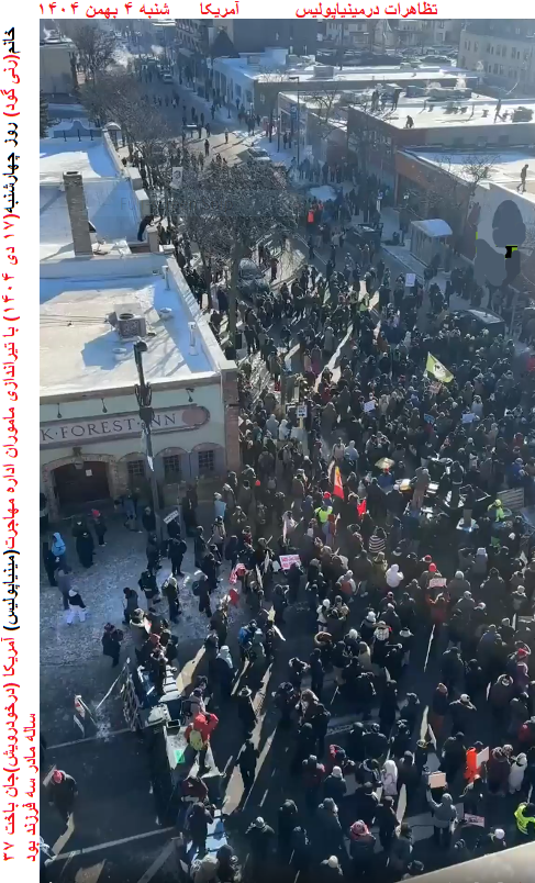 تظاهرات شنبه ۲۴ ژانویه ۲۰۲۶(۴ دی ۱۴۰۴) در «شهرمینیا پولیس»آمریکا پس از تیراندازی مرگبار(چهارشنبه۱۷ دی ۱۴۰۴) به یک زن مهاجر شهروندآمریکا. معاون وزیر امنیت داخلی آمریکا اعتراضات مردمی را اقدام آشوبگرانه و تروریستی نامید.