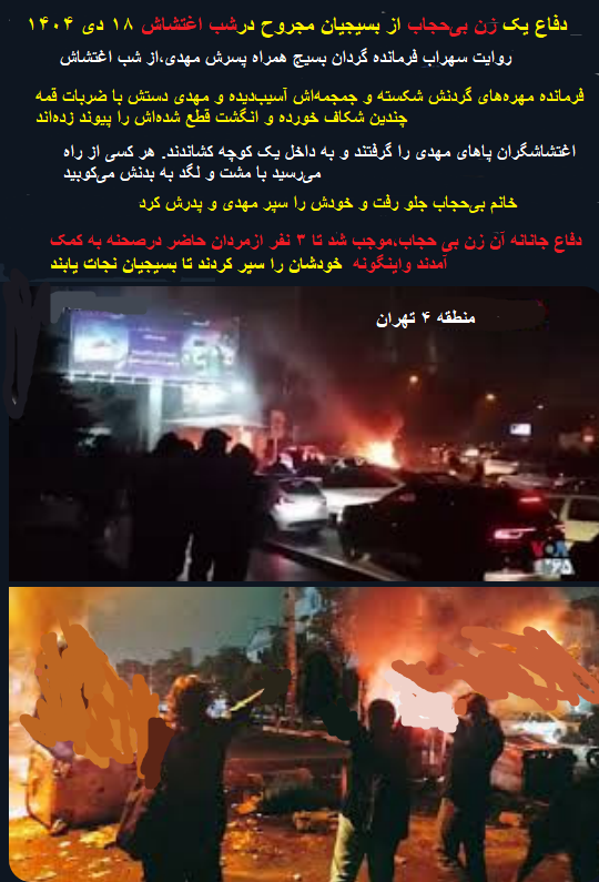 دفاع یک زن بیحجاب از بسیجیان مجروح درشب اغتشاش ۱۸ دی ۱۴۰۴ منطقه۴ تهران