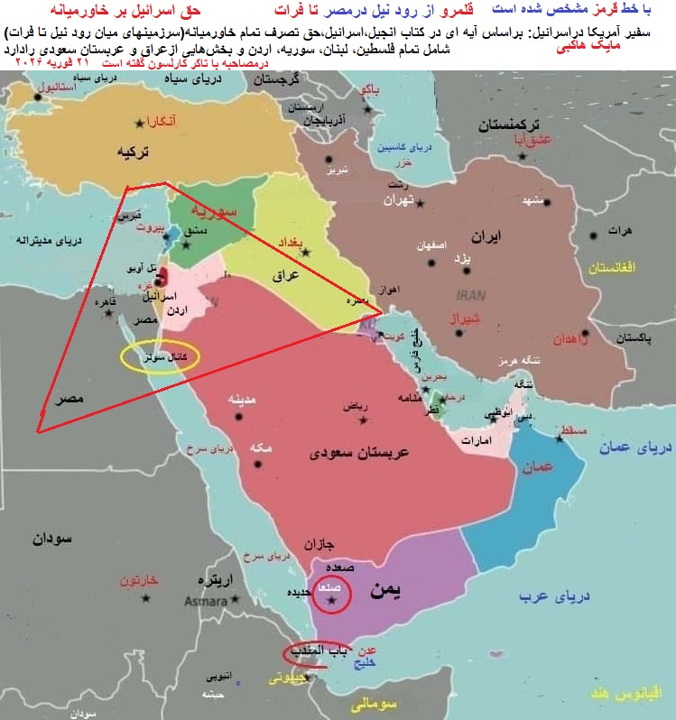 سفیر آمریکا دراسرائیل:(براساس آیه ای در کتاب انجیل )«اسرائیل،حق تصرف تمام خاورمیانه»(میان رود نیل تا فرات)منطقهای شامل تمام فلسطین، لبنان، سوریه، اردن و بخشهایی از عربستان سعودی و عراق را تصرف کند،اگر اسرائیل همهاش را هم بگیرد، اشکالی ندارد.