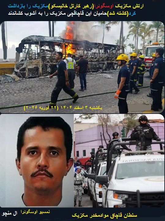 شورشهای خیابانی در مکزیک... قاچاقچی مواد مخدر در یکشنبه ۰۳ اسفند ۱۴۰۴ (۲۲ فوریه ۲۰۲۶) دستگیر شد.