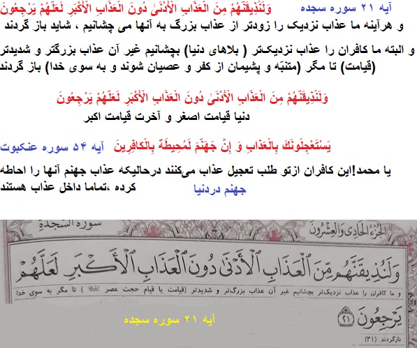 وَ لَنُذِیقَنَّهُمْ مِنَ الْعَذابِ الْأَدْنى دُونَ الْعَذابِ الْأَکْبَرِ لَعَلَّهُمْ یَرْجِعُونَ (آیه ۲۱ سجده)