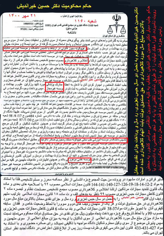 اما دادگاه تجدیدنظر استان تهران هم در تاریخ ۲۲ خرداد ۱۴۰۳ بر این موضوع صحه میگذارد که «دکتر حسین خیراندیش و فرزندانش» که متهمان این پرونده کلاهبرداری هستند، بدون داشتن مجوز قانونی اقدام به تاسیس موسسهای آموزشی و دانشگاهی کرده و با انجام تبلیغات و امیدوار کردن اشخاص به اعطاء مدرک دانشگاهی معتبر مورد تایید وزارت، مبادرت به ثبت نام دانشجو و فعالیت آموزشی در رشته طب سنتی نمودهاند و مبالغی نیز از شاکیان دریافت کردهاند.
