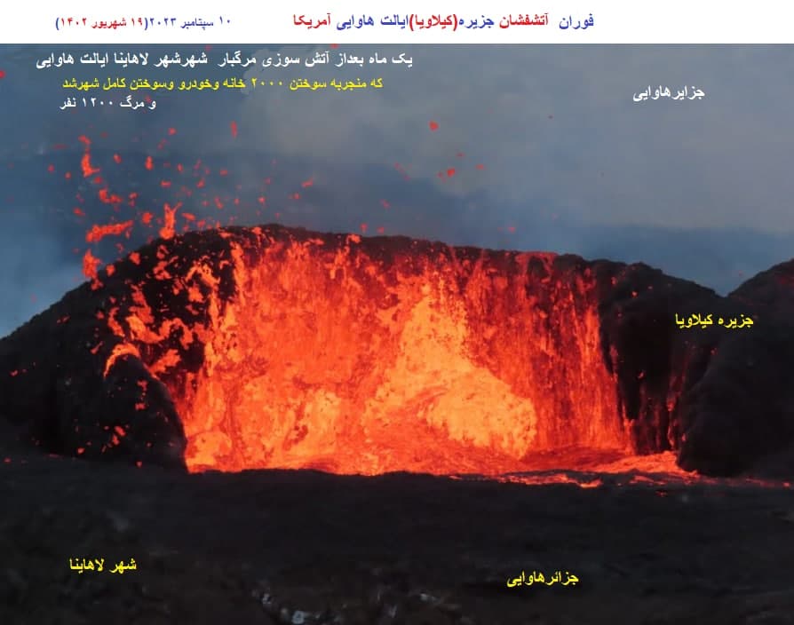 توضیح مدیریت ساست-پیراسته فر:فوارهها و جریانهای گدازه در فوران«آتشفشان کیلاویا» در «جزایرهاوایی»(آمریکا) درروز یکشنبه ۱۰ سپتامبر ۲۰۲۳(۱۹ شهریور ۱۴۰۲) شهرلاهینا