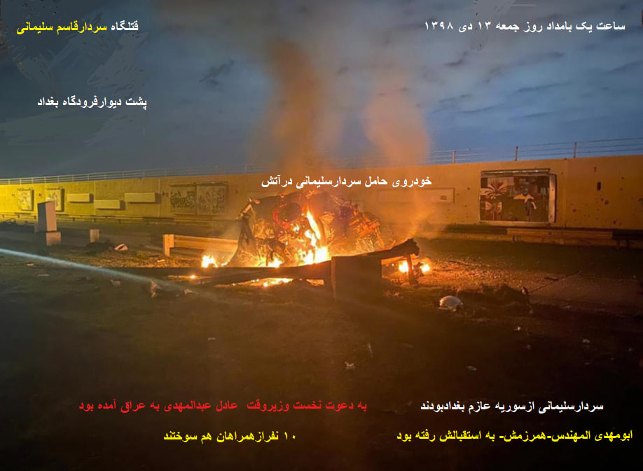 توضیح مدیریت سایت-پیراسته فر:«شهادت سردارقاسم سلیمانی» جمعه(۱۳ دی ۱۳۹۸) ۲ خودرویی که در حال انتقال «حاج قاسم سلیمانی» و «ابومهدی المهندس» از فرودگاه بغداد به سمت شهر بغداد بودند، مورد اصابت حملات موشکی نیروهای آمریکایی قرار گرفتند و تمام سرنشینان آن که ۱۰ نفر از همراهان سردار سلیمانی و ابومهدی از محافظان و همراهان بودند همه به شهادت رسیدند، سپهبد سلیمانی در ساعت ۲۴ پنجشنبه از سوریه آماده بود.