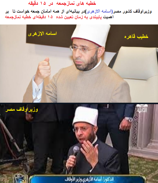 وزیراوقاف کشور مصر(اسامه الازهری)در بیانیهای از همه امامان جمعه خواست تا بر اهمیت پایبندی به زمان تعیین شده ۱۵ دقیقهای خطبه نمازجمعه