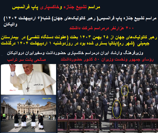 توضیح مدیریت سایت-پیراسته فر:«وزیرفرهنگ و ارشاد اسلامی ایران»(سیدعباس صالحی) و «سفیر ایران در واتیکان»(حجتالاسلام محمدحسین مختاری)در«مراسم خاکسپاری پاپ فرانسیس»شنبه ۲۶ آوریل ۲۰۲۵ (۶ اردیبهشت ۱۴۰۴)یک ردیف فاصله با رئیس جمهورآمریکا(دونالدترامپ)سفیرایران درحال عکسبرداری ازمراسم.