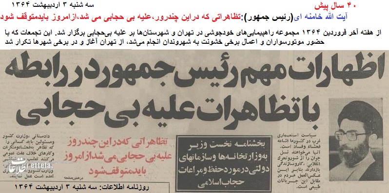 ۴۰ سال پیش:آیت الله خامنه ای(رئیس جمهور):تظاهراتی که دراین چندرور،علیه بی حجابی می شد،ازامروز بایدمتوقف شود./۳ اردیبهشت ۱۳۶۴