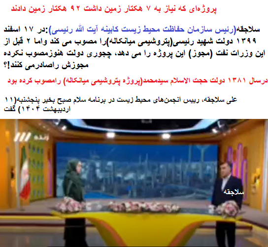 پروژهای که نیاز به ۷ هکتار زمین داشت ۹۲ هکتار زمین دارد،در ۱۷ اسفند ۱۳۹۹ دولت شهید رئیسی(پتروشیمی میانکاله)را مصوب می کند واما ۲ قبل از این وزارت نفت (مجوز) این پروژه را می دهد، چجوری دولت هنوزمصوب نکرده مجوزش راصادرمی کنند!؟