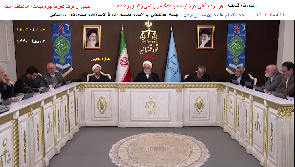 رئیس قوه قضائیه گفت: یکی از مسائلی که در مجلس درباره آن صحبت شد، موضوع ترک فعل است. «من بارها گفتهام که هر ترک فعلی الان جرم نیست» چون قانون میخواهد.