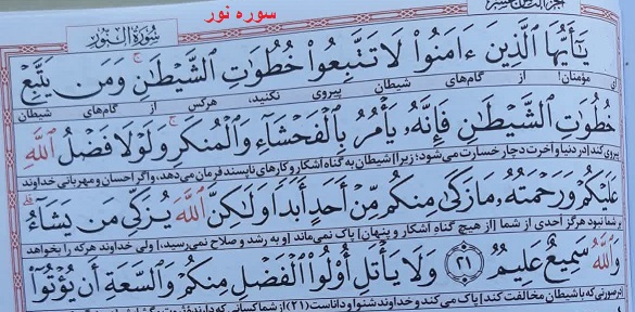 یا أَیُّهَا الَّذِینَ آمَنُوا لا تَتَّبِعُوا خُطُواتِ الشَّیْطانِ وَ مَنْ یَتَّبِعْ خُطُواتِ الشَّیْطانِ فَإِنَّهُ یَأْمُرُ بِالْفَحْشاءِ وَ الْمُنْکَرِ وَ لَوْ لا فَضْلُ اللَّهِ عَلَیْکُمْ وَ رَحْمَتُهُ ما زَکى مِنْکُمْ مِنْ أَحَدٍ أَبَداً وَ لکِنَّ اللَّهَ یُزَکِّی مَنْ یَشاءُ وَ اللَّهُ سَمِیعٌ عَلِیمٌ (۲۱ نور)