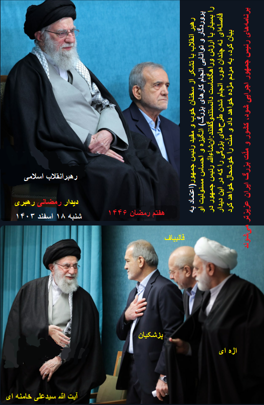 رهبر انقلاب اسلامی عصرروزشنبه هفتمن روز ماه رمضان۱۴۴۶(۱۸ اسفند ۱۴۰۳) در دیدار سران قوا و جمع زیادی از کارگزاران و مدیران ردههای مختلف کشور، ضمن بیان توصیههای رمضانی درباره خودفراموشی فردی و اجتماعی و تبعات آنها، اصلاح وضع اقتصاد و بهبود معیشت مردم را بسیار مهم خواندند و علاوه بر تشریح ظرفیتها و راهکارهایی که ربطی به تحریم ندارد، گفتند: انسجام و همکاری قوا و همه سطوح مسئولیتی، اصلاح نظام ارزی، حفظ ارزش پول ملّی، حمایت همهجانبه از تولید و سرمایهگذاری، سرعت عمل در تصمیمگیری و اجرا و به ثمر نشستن طرحها، پرهیز از بیتصمیمی و رها شدن کارها و مبارزه جدی با قاچاق، در دستورکار همه مسئولان و دستگاهها قرار گیرد.