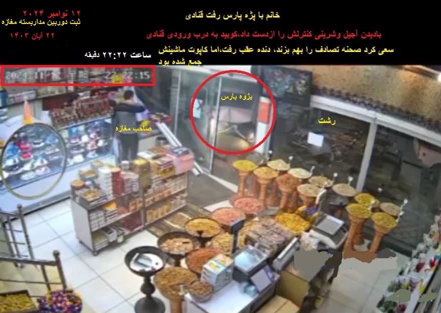 ورود یک راننده خانم با (خودرو پژوه پارس) به یک «قنادی» در رشت