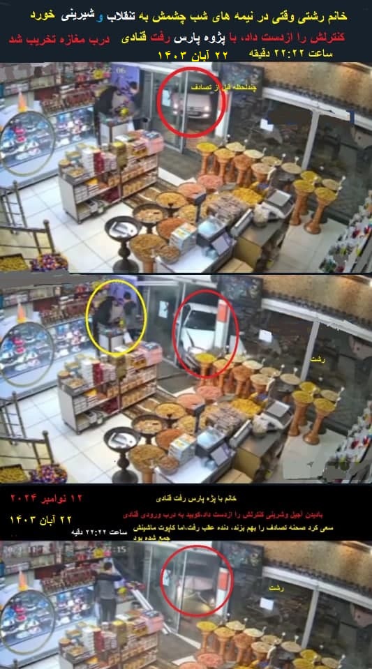 توضیح مدیریت سایت-پیراسته فر: راننده خانم نتوانست خودرو راکنترل بکند با خودرو به یک شیرینی فروشی در رشت کوبید،درب قنادی تخریب شد،جلوبندی خودروی خانم هم آسیب دید،«کاپوت»(خودرو) جمع شد واما خانم ،قبل از توقف(برای برهم زدن صحنه تصادف)دنده عقب زد وکشیدعقب.