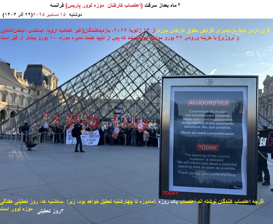 توضیح مدیریت سایت-پیراسته فر:کارگران موزه لوور روز دوشنبه ۱۵ دسامبر ۲۰۲۵(۲۴ آذر ۱۴۰۴) به دلیل شرایط کاری و دیگرمشکلات به اعتصاب رأی دادند که این اعتصاب(پس از سرقت شرمآور جواهرات در یکشنبه ۱۹ اکتبر ۲۰۲۵(۲۷ مهر ۱۴۰۴))ضربه دیگری به این بنای تاریخی پاریس و خانه «مونالیزا» وارد کردند.