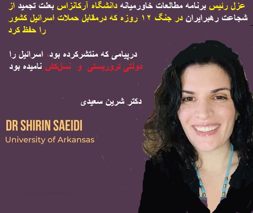 روز شنبه۱۳ دسامبر ۲۰۲۵ (۲۲ آذر ۱۴۰۴)«روزنامه نیویورک پست» به نقل از سخنگوی دانشگاه گزارش داد که این دانشگاه روز جمعه ۱۲ دسامبر ۲۰۲۴(۲۰ آذر ۱۴۰۴) «شیرین سعیدی»(استاد علوم سیاسی دانشگاه آرکانزاس) را برکنار کرد.