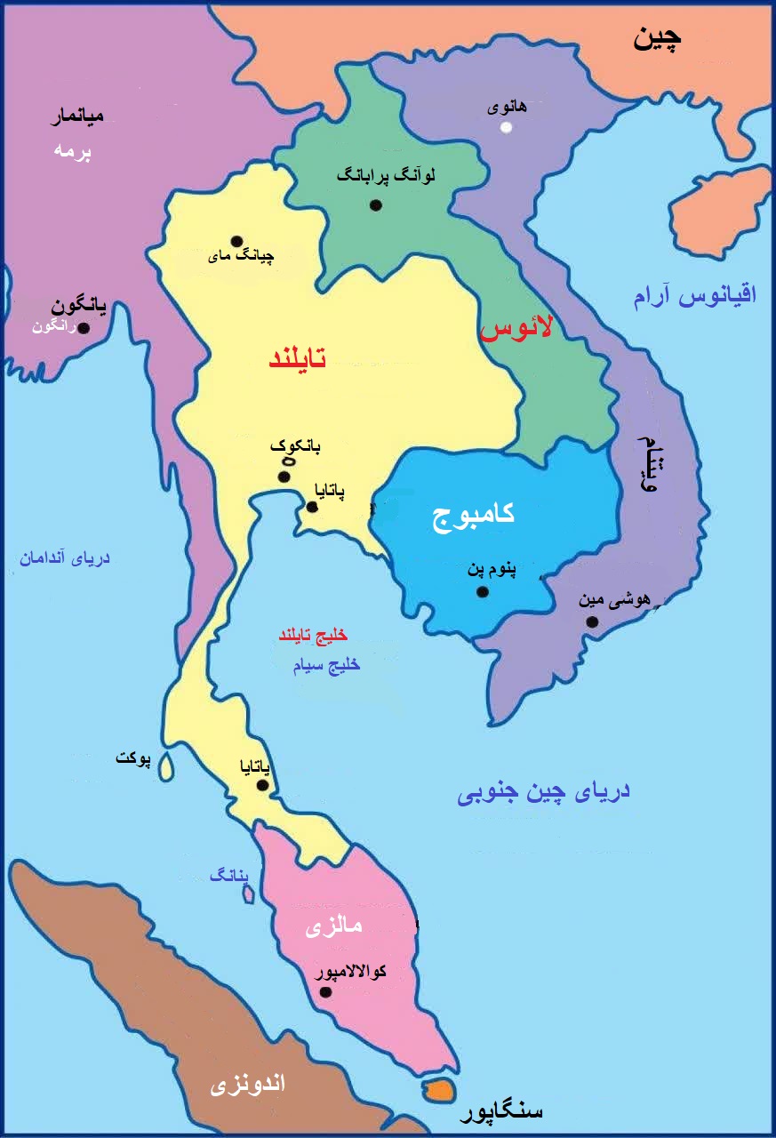 «تایلند کجاست؟»: تایلند، در بخش مرکزی شبه جزیره هندوچین واقع شده است. این کشور از غرب با میانمار (برمه)، از شمال شرقی با لائوس، از جنوب شرقی با کامبوج و از جنوب با مالزی مرز مشترک دارد.