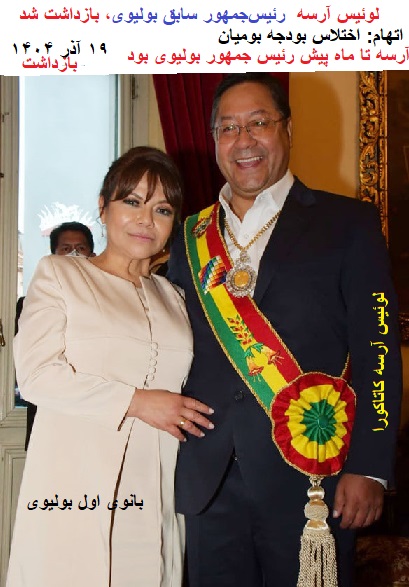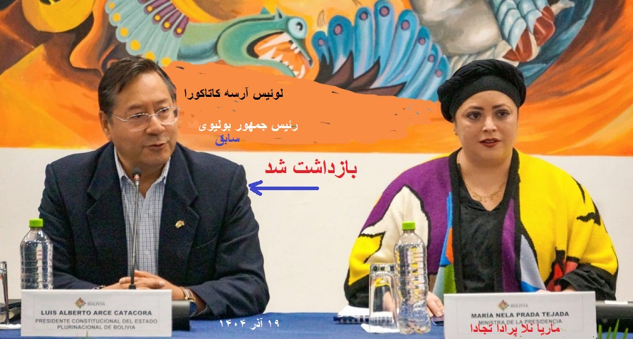 توضیح مدیریت سایت-پیراسته فر:لوئیس آرسه، رئیس جمهور سابق بولیوی، روز چهارشنبه ۱۰ دسامبر ۲۰۲۵(۱۹ آذر ۱۴۰۴)در«محله سوپوکاشی» شهر «لاپاز» دستگیر شد و به مقر پلیس منتقل شد،این دستگیری مرتبط با بودجه برای بومیان بولیوی میباشد.