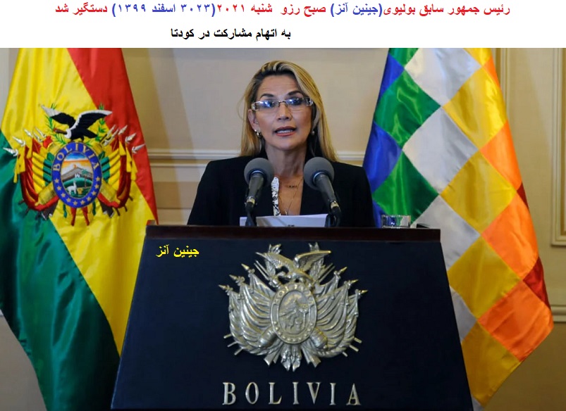 خانم«جینین آنز»رئیس جمهور سابق بولیوی، صبح رزو شنبه ۲۰۲۱(۳۰۲۳ اسفند ۱۳۹۹) دستگیر شد و در بازداشت پلیس است. دستگیری آنز توسط «کارلوس ادواردو دل کاستیلو دل کاپریو» وزیر دولت بولیوی، تأیید شد.