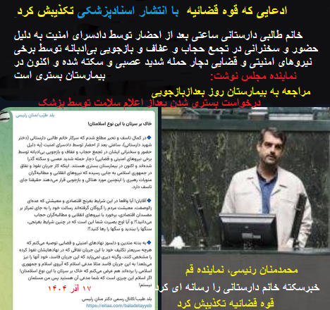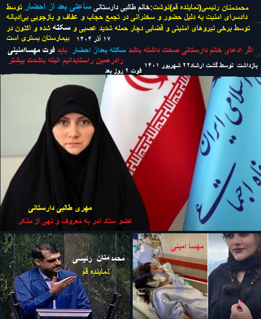 «محمدمنان رییسی» در کانالش در شبکه ایتا نوشت: وقتی ساعات پایانی روز دوشنبه(۱۷ آذر ۱۴۰۴ )نوشت:«مهری طالبی دارستانی» عضو پیشین ستاد امر به معروف و نهی از منکر بعد از احضار به دادستانی در اثر فشار سکته کرده و در بیمارستان بستری است،خانم طالبی دارستانی ساعتی بعد از احضار توسط دادسرای امنیت به دلیل حضور و سخنرانی در تجمع حجاب و عفاف و بازجویی بیادبانه توسط برخی نیروهای امنیتی و قضایی دچار حمله شدید عصبی و سکته شده و اکنون در بیمارستان بستری است.
