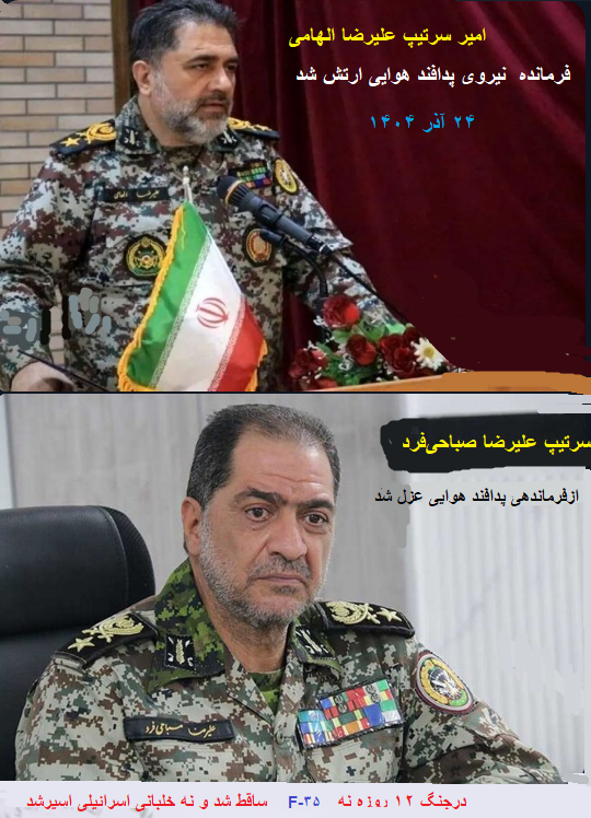 «سرتیپ علیرضا صباحیفرد»(فرمانده نیروی پدافند هوایی ارتش)برکنارشد...«امیر سرتیپ علیرضا الهامی»(فرمانده نیروی پدافند هوایی ارتش)شد ۲۴ آذر ۱۴۰۴